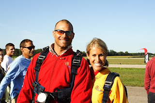 35ish seconds of free-fall felt more like someone put a 122 mph fan in front of me – the wind resistance was insane (and chilly!) – but what a rush!!! I screamed/laughed so much that the wind took all the saliva out off my teeth and my mouth was super dry. haha! After we dropped about 6,000 ft, the instructor gave me the signal to pull the ripcord and we came halting to a slow, peaceful float above the ground for about 10 minutes. By this time, I could see the images of my family on the ground (and glimpses of Mike in the air with me) – it was so surreal to be floating so high as if I was looking out of a plane, only to look down and see my tennis shoes dangling below me.